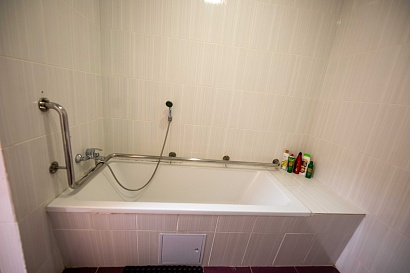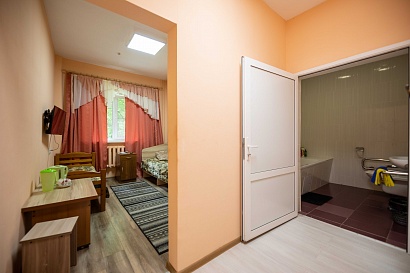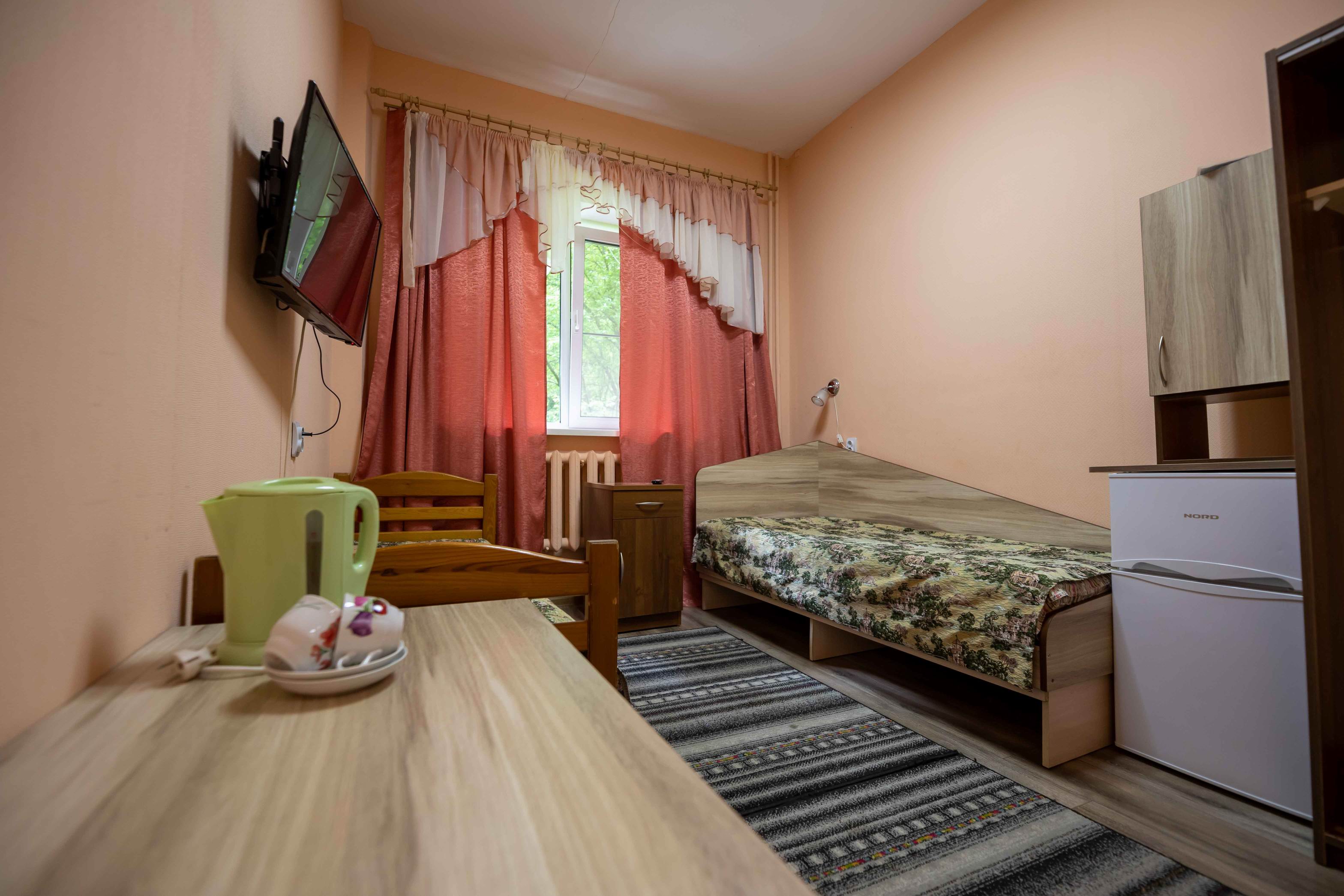 В номере: ванная комната с душевой кабиной, санузел, ТВ, электрочайник, холодильник, посуда , фен, 1,5 спальная кровать, шторы с полным затемнением комнаты, тумбочки, стулья, шкаф.